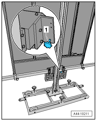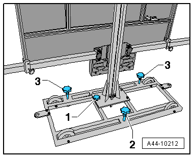 - Secure the Setting Device Basic Set -VAS6430/1- by tightening the bolts -2- and -3- slightly. (This prevents the Setting Device Basic Set -VAS 6430- from rolling away).