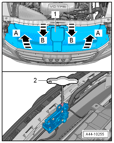 - To do so open the hood and remove the lock carrier cover -1-. Refer to → Body Exterior; Rep. Gr.63; Front Bumper; Overview - Bumper Cover.