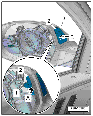 - Open the tab in direction of -arrow A- and remove the warning lamp -2- from the exterior rearview mirror housing -3- in direction of -arrow B-.