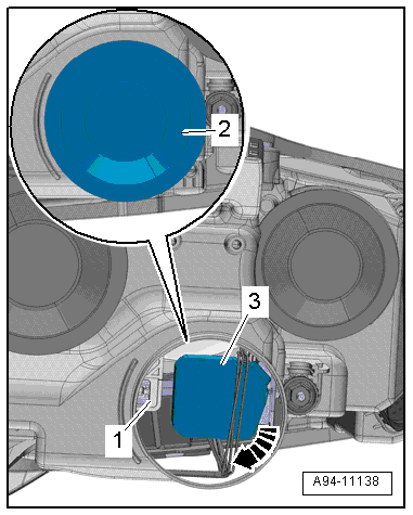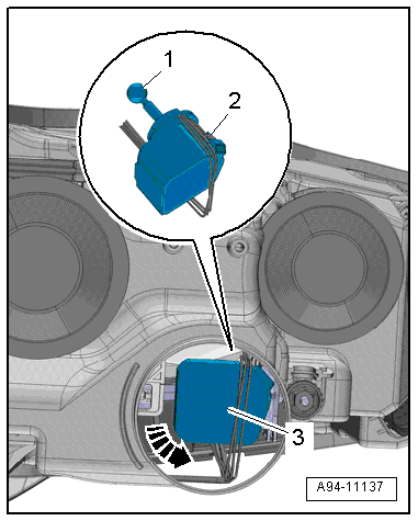 - Pull the reflector -1- toward the rear. When doing this, the ball head mount -2- must fit into the guide -3- on the housing in direction of -arrow A-.