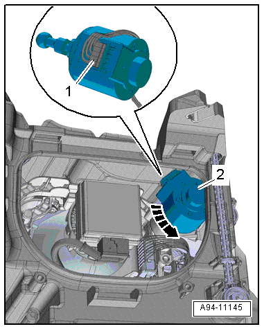 - Move the adjustment motor -1- upward in direction of -arrow-. The ball head on the adjusting axle will disengage downward from the ball head mounting when doing this.