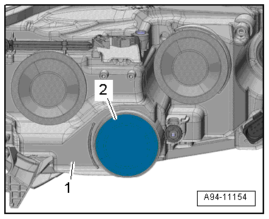 - Close the opening in the headlamp housing -1- with the housing cover -2- from the repair kit. Refer to the Parts Catalog.