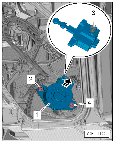 - Remove the headlamp beam adjustment motor by pushing the ball head of the positioning stem upward -arrow- and out of the ball head mount -4- by turning the adjustment motor.
