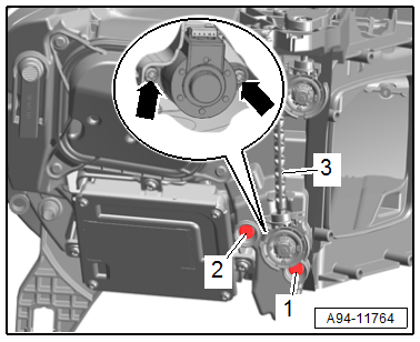 - Turn the adjustment motor -3- counter-clockwise -arrow- and remove it upward. This disengages the ball head -1- downward from the ball head mount.