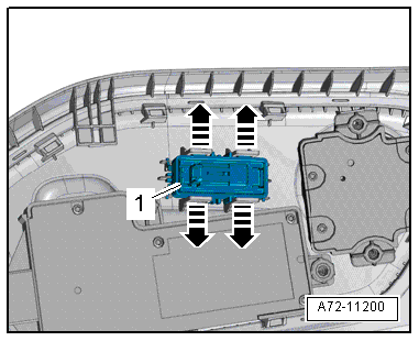 - Press out massage function button -1- from the trim and remove it by releasing the locks -arrows-.