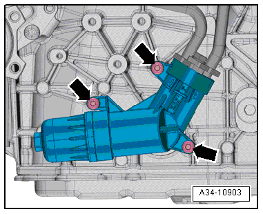 - Remove the bolts -arrows- and remove the ATF filter housing. Refer to → S tronic Transmission; Rep. Gr.34; ATF Circuit