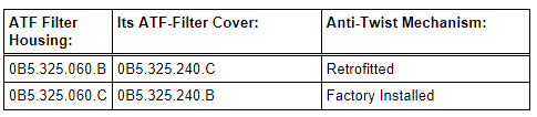 The retrofittable anti-twist mechanism and the related ATF filter cover are available from 07/2014. Refer to the Parts Catalog.