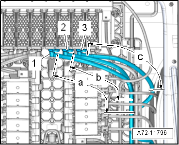 - Disconnect the pneumatic lines -1, 2 and 3- from the lumbar support air cushions at the following locations: