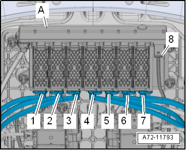- Disconnect the pneumatic lines -1 through 7- from the valve block -A-.