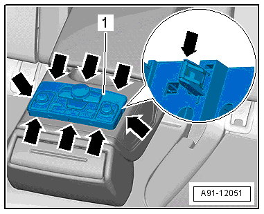 Spring clips attach the -1- the Multimedia Control Head 2 -E499--2- to the rear center armrest.