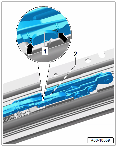 - For a correct adjustment, the tab -1- must be with the guide piece -arrows- the slotted rail -2- between both markings as shown in the illustration cut-out.