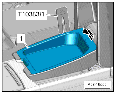 - Unclip the storage compartment -1- from the center armrest starting at the back using the Wedge Set -T10383/1--arrow-.