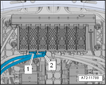 - Carefully release the retainer -arrow- and disconnect the pneumatic lines -1 and 2-.