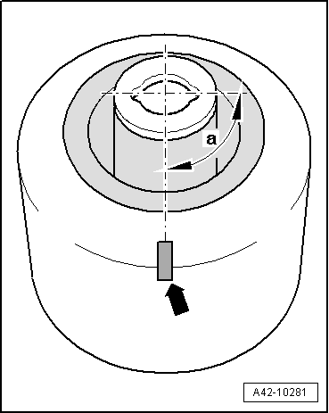- Install the rubber bonded bushing with the marking -arrow- into the subframe so that the marking points exactly in the driving direction.