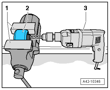 - Position the drill -3- on the bonded rubber bushing -2- as illustrated and drill the hole in several steps.