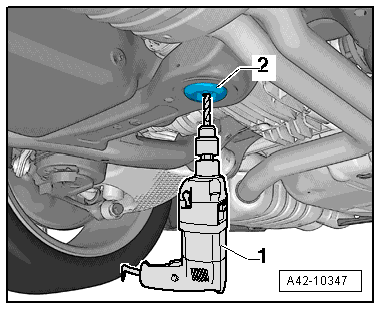- Position the drill -1- on the bonded rubber bushing -2- as illustrated and drill the hole in several steps.