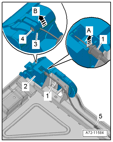 - Remove the release cable -1- from the locking mechanism -2- in direction of -arrow A-.