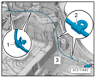 - Unclip the brackets -1 and 2- for the release cable and remove the release cable -3- along with the coupling rod.