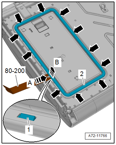 - Remove the rear release -1- with the Trim Removal Wedge -3409- beginning from the luggage compartment side trim panel in direction of -arrow-.