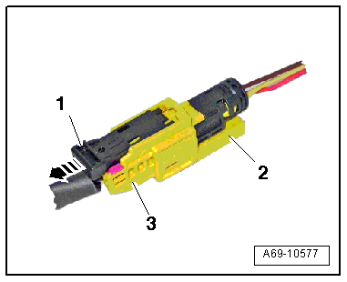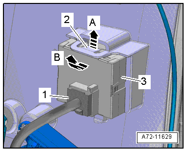 - Pull the locking mechanism -1- in direction of -arrow- and disconnect the electrical connectors -2- and -3-.