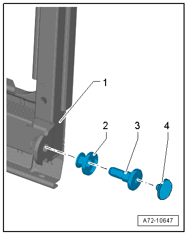 - Remove the chafe protection -4- and then remove the mounting pin -3- from the rear seat backrest frame -1-.