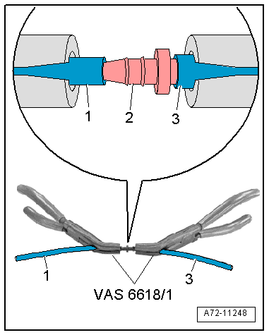 - Slide the pneumatic lines -1 and 3- onto the line connector -2- on both sides using the Pneumatic Repair Set - Pliers -VAS6618/1-. Refer to the Parts Catalog.