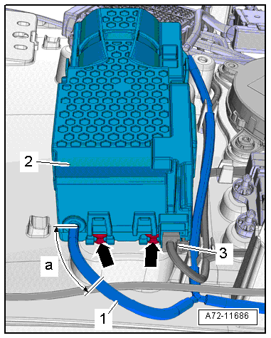- Disconnect the pneumatic line -3- to the Valve Block 2 in Driver Side Rear Seat -N480-/Valve Block 2 in Passenger Side Rear Seat -N482- or Valve Block 3 in Driver Side Rear Seat -N525-/Valve Block 3 in Passenger Side Rear Seat -N526--2- at the following position. Refer to → Chapter "Pneumatic Lines, Disconnecting and Connecting".