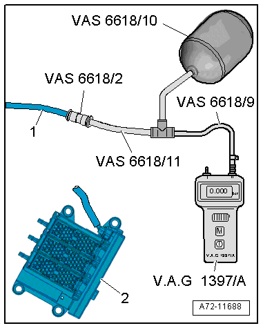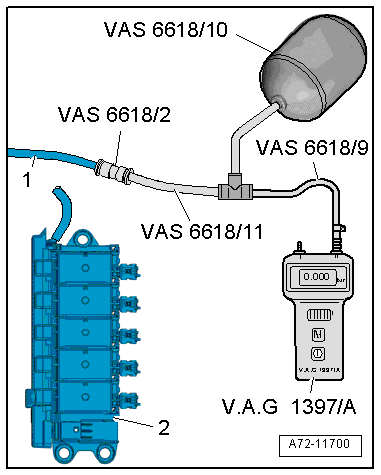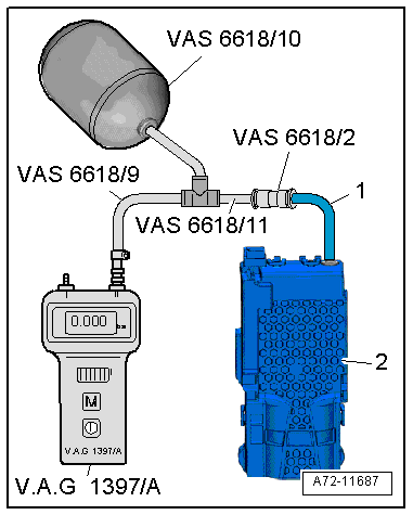 - Using hose and adapter pieces, as well as the Pneumatic Repair Set - Surge Tank -VAS6618/10-, connect the Turbocharger Tester Kit -VAG1397A- with the pneumatic line -1- coming from the compressor.
