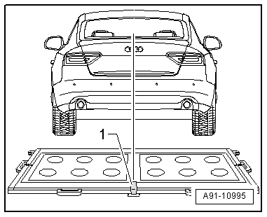 - Switch on the Calibration Tool - Linear Laser -VAS6350/3--1- on the calibration board and adjust the entire Calibration Tool -VAS6350- so that the laser beam hits the center of vehicle rear above the Audi rings.