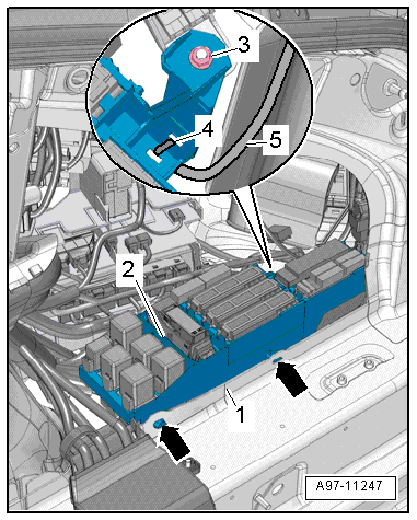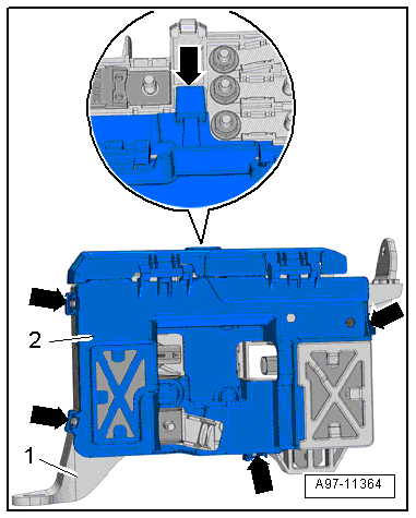 - Release the retainers in direction of -arrows- and remove the relay carrier -2- from the relay/fuse panel -1- to the rear.