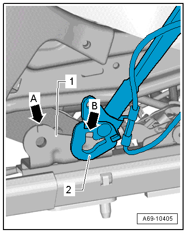 - Position the seat belt latch -2- so that the cut-out -arrow B- lines up with the hole -arrow A- on the lower seat frame -1-.