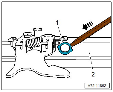 - Pry out the bushing -1- on both seat rails -2- in direction of -arrow-.