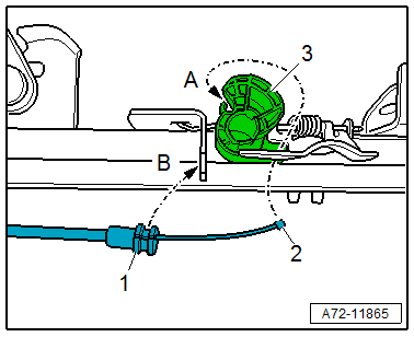 - Engage the release cable sheath -1- in the bracket -arrow B-.