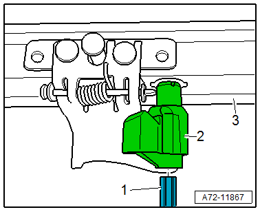 - Insert the release lever -2- for the inner seat rail (tunnel side) into the seat rail -3-.
