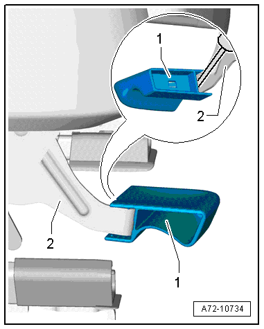 - Disengage the tunnel-side trim -2- from the backrest hinge and remove it.