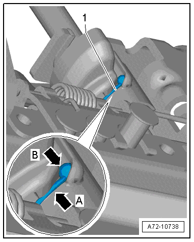 - Disengage the release cable -1- that seat forward/back release cable mount -arrow A-.