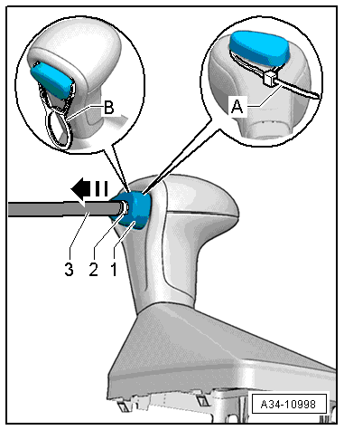 - Remove the locking button from the selector lever handle -arrow- and secure it with a cable tie -A- or an assembly aid -B-, as illustrated.