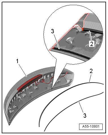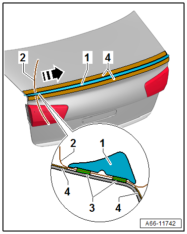 - Insert the Cutting Tool for Bonded Windows - Wire -VAS6452/2--2- on one side between the spoiler -1- and the rear lid.