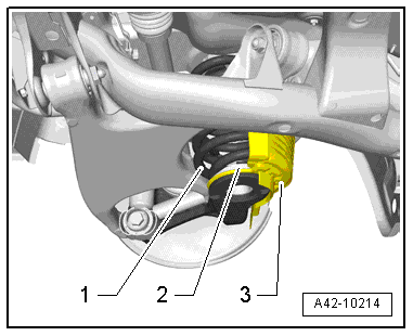 - Position the coil spring with the lower spring plate -3- and stone chip protection -1- on the wheel bearing housing -2-; installed position. Refer to → Fig. "Lower Spring Plate Installed Position".