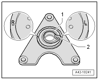 - Insert the left coil spring on the spring plate -1- so the stop -2- aligns with the marking "L". Only applies to the left coil spring.