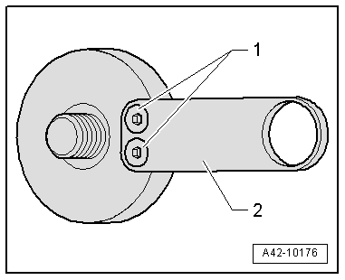 - Remove the bolt -arrow- and the previous spring plate -1- with the hole -2- without the counter bore.
