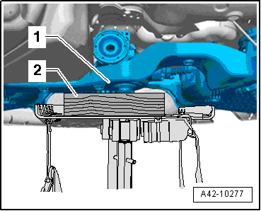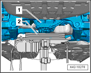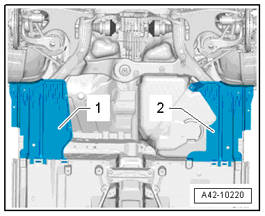 - Remove the underbody covers -1 and 2-. Refer to → Body Exterior; Rep. Gr.66; Underbody Trim Panel; Underbody Panels, Removing and Installing.