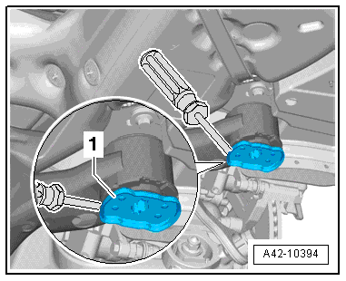 - Pry the stop plate -1- off the bonded rubber bushing alternating from side to side.
