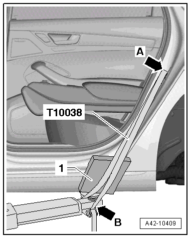 - Place a piece of foam rubber -1- between the sill panel and the Tensioning Strap -T10038- and then tension the Tensioning Strap -T10038-.