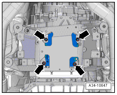 - Remove the bolts from the tunnel crossmember -arrows-.