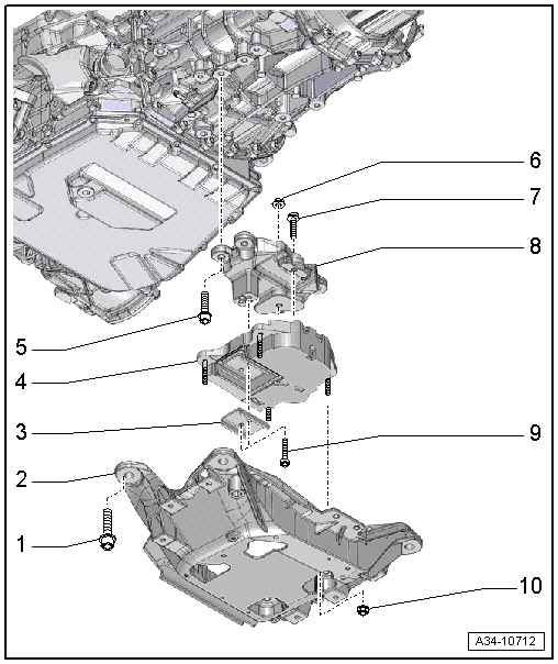 If the tunnel crossmember was removed in or to check or add transmission fluid, then it is necessary to bring the transmission back into its installed position after removing the tunnel crossmember. This is the only way the transmission fluid level can be adjusted correctly, refer to → Chapter "Transmission Fluid Level, Checking".
