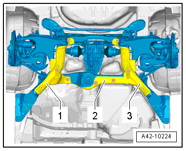 - Remove the left and right bolts -2- and free up the bracket -3- from the subframe.