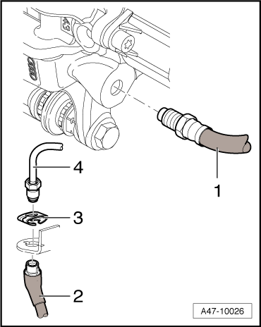 - Disconnect the right and left brake line -4- on the brake hose -2-. Refer to → Brake System; Rep. Gr.46.