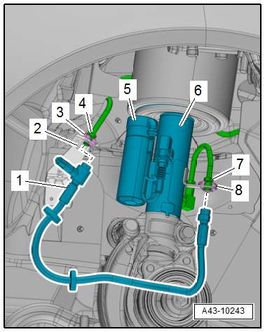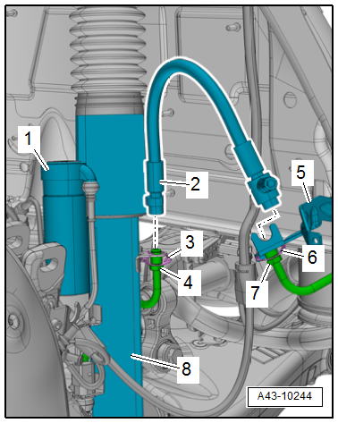 A small oil leak at the connection that results from connecting or disconnecting the charging device DRC Pressure Tester -VAS6209/2- is not critical. Multiple measurements should be avoided since the system loses a little amount of oil each time the DRC Pressure Tester -VAS6209/2- is connected. Every connection results in a pressure decrease of approximately 0.3 bar (4.3 psi) from the previous reading. Multiple repeated measurements decrease system pressure below minimum pressure or failure.