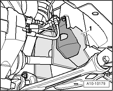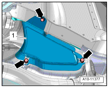 - Remove left and right drive axle cover -1- in the wheel housing, refer to → Body Exterior; Rep. Gr.66; Noise Insulation; Overview - Noise Insulation.